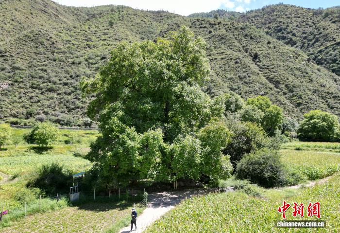 图为千年“胡桃王”全貌。(无人机照片)中新社记者 张浪 摄 图为树主泽仁扎西采摘果实。中新社记者 张浪 摄