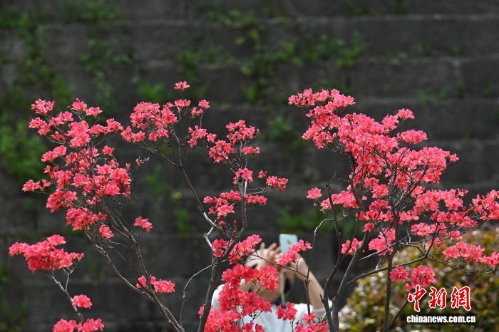 4月17日,江苏南京,明城墙下杜鹃花进入盛花期,红色、粉色的花朵层层叠叠,与古朴的城墙、建筑相互映衬,让人流连忘返。中新社记者 泱波 摄