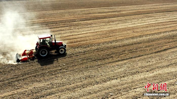 中新网兰州3月26日电 (马爱彬)3月底,甘肃省武威市民勤县苏武镇元台村高标准农田里机器轰鸣,搭载浅埋滴灌水肥一体化技术的小麦播种机来回穿梭,一次性完成开沟、播种、施肥、铺设滴灌带、覆土等多道工序,为沙漠边缘
